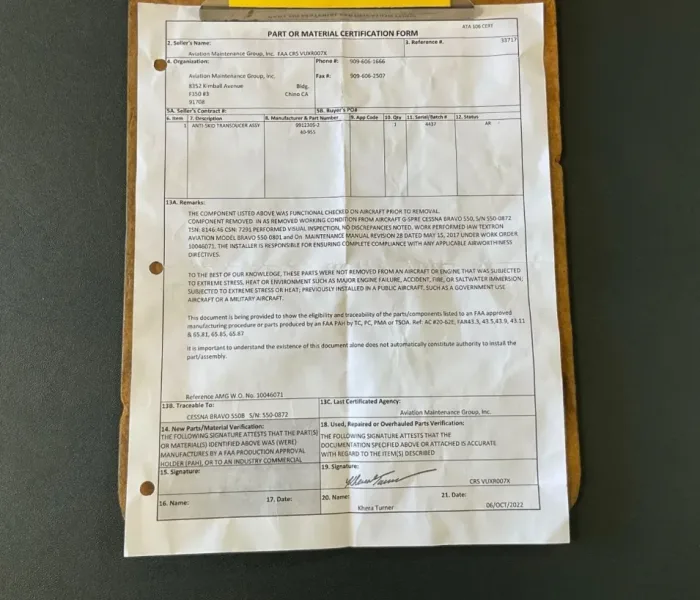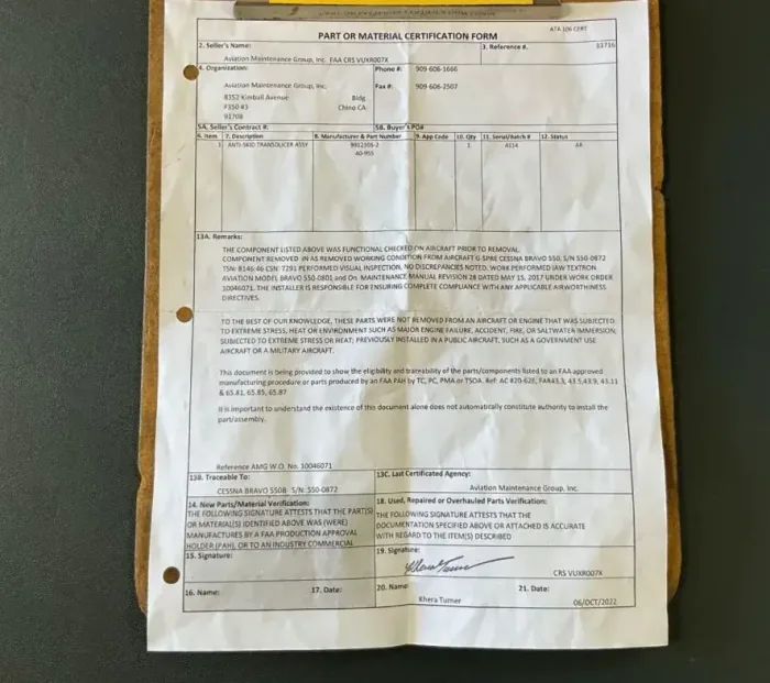 This item is sold as-is, exactly as described. The buyer is responsible for verifying applicability, airworthiness, fitment, and eligibility for the intended aircraft and installation in accordance with applicable regulatory authority and maintenance manual requirements prior to purchase or installation.